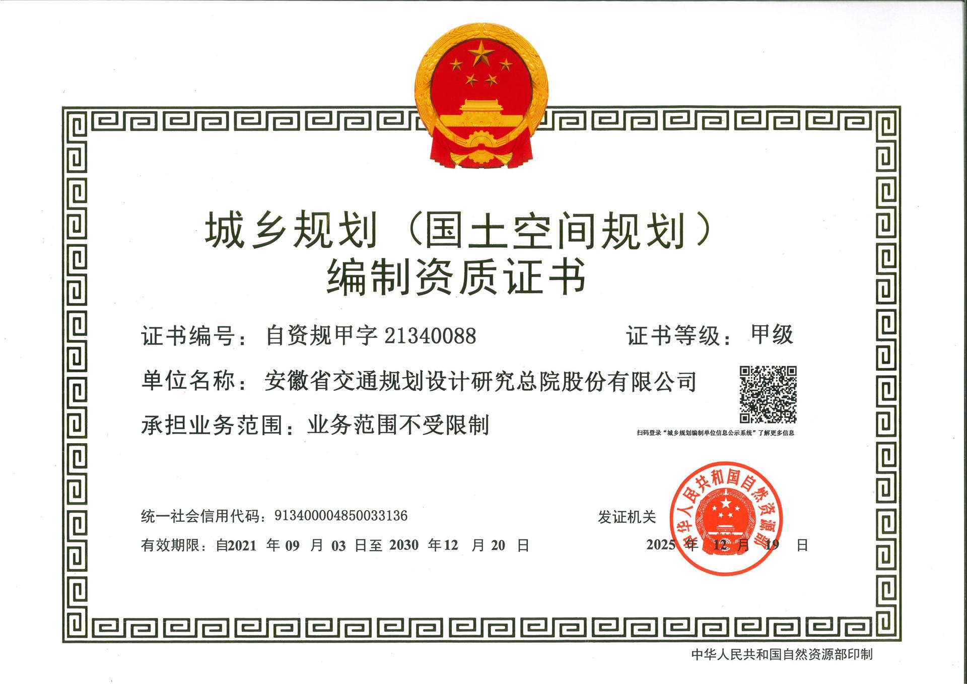 伟德国际victor1946城乡规划编制甲级资质获自然资源部核准延续