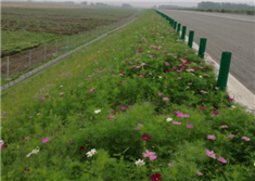 植物纤维毯属节能环保草毯,使用简单如铺地毯覆盖坡面即可,适用于强弱分化岩质、土质和沙土等各类边坡绿化,能为植物生长提供必须条件,固沙、护坡和防止水土流失作用明显,植被恢复也是有效绿化手段,防护方式更贴近自然。本项目部分低矮边坡开发应用植物纤维毯新技术,契合绿色公路设计理念。