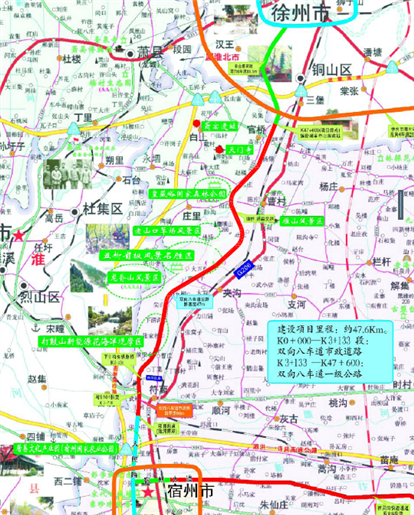 本项目连接宿州和徐州两市,在国省道干线网中编号为S404,道路具有一级干线公路功能,是徐宿双城一体化的重要交通要道;同时项目起点位于市区段,顺接人民路北延工程,故兼具有城市主干路功能。路线起于宿州市埇桥区人民路北延工程终点,向北分别跨濉河、股河,与101省道平交,再向北在高皇山西侧穿越符夹铁路,经王楼、张楼、清水、尖山等村庄至五柳风景区,经过胡瞳村东侧,向北经镇瞳村、沿鹰咀山山脚至萧县前白,沿现状S404走廊带东侧,从官桥镇东侧绕过集镇,终点接至与徐州市交界处梁庄村,与徐州市规划的中山路南延段连接。