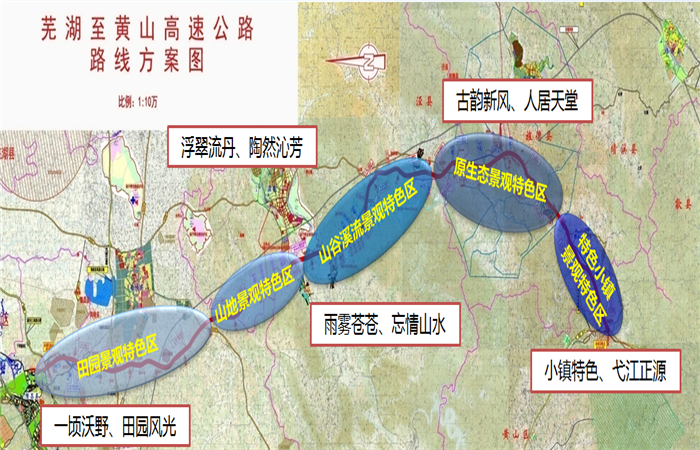 S11芜黄高速项目区域物产丰富、历史悠久、人文荟萃、特点鲜明。区域内群山环抱、河流纵横、森林覆盖率高,自然景观好,素有七山一水一分田,一分道路和庄园之说;所经各县建制久远,人才辈出、徽派古建筑保存完好;宣纸宣笔宣砚工艺精湛、闻名遐迩;作为南方革命老区,也因为“新四军”和“皖南事变”的影响,使项目沿线多处成为红色旅游教育基地。