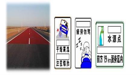 (2)彩色防滑标线:为防止驾驶员疲劳驾驶,我们设计了彩色防滑标线,以大色块冲击驾驶员视觉;其次,设置了多处有别于内地的行车安全提醒标志