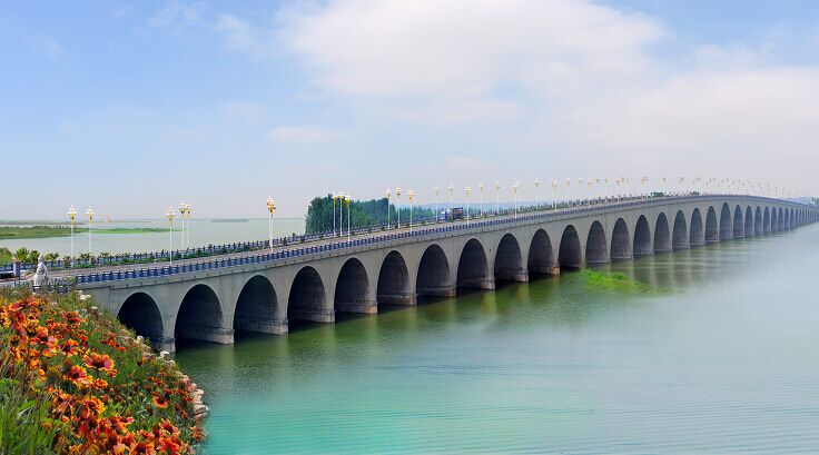 山东济宁北湖连通桥位于济宁市南阳湖与小北湖之间,为发展城市生态建设及更好的展示水城风貌,济宁市将南阳湖与小北湖两湖之间通过开凿河道连接起来,使其湖水贯通,两湖成一湖,故在此建设桥梁一座,桥位处湖面宽度1000米。连通桥为37孔连续拱桥,中孔净孔径为35米,向两侧孔径依次递减,最小净孔径为15米。桥长1009米。桥梁中孔单幅布置,其余桥孔双幅布置,全桥孔数计算为1(主孔)+36×2(双幅)=73孔;“1+72”寓意“孔子及七十二贤人”,孔子乃圣人,由此桥命名为“圣贤桥”。桥梁长度1009米,桥梁宽度37.5米,双幅布置。总投资约3.8亿元。