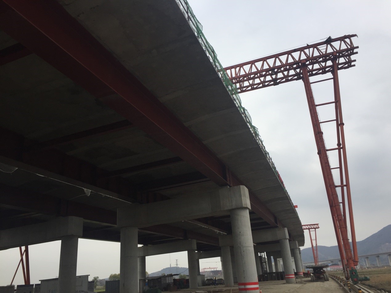 3、在国内首次采用架桥机架设钢板组合梁工法。