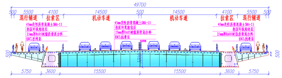 主桥横断面布置:0.5m(护栏)+5.5m(混行辅道)+4.1m(吊索区)+14.5m(机动车道)+0.5m(护栏)+14.5m(机动车道)+4.1m(吊索区)+5.5m(混行辅道)+0.5m(护栏),全宽49.7m。