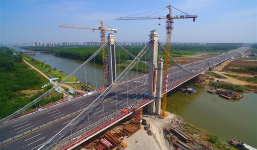 颍柳路泉河大桥为典型的城市景观特大桥,桥梁全长755m,主桥为22(锚固跨)+82+115+22 (锚固跨) m,独塔不等跨自锚式悬索桥,为我省第一座该结构体系桥梁,主桥全宽43.5m,含双向8车道及两侧人行道。项目2015年12月完成设计,2017年获安徽省土木建筑创新奖二等奖, 2019年5月交工通车。