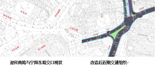 4)K型交口改造方案。迎宾路、宁阳路交口为异形交叉口,受道路周边建筑物所限,设计提出十字型交口、分段灯控交口两种设计方案,对交口交通流进行渠化改造,实施后区域交通得到极大改善。
