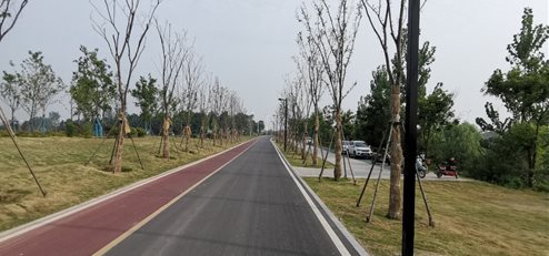 环湖绿道起于人民中路与堤顶路交叉口,向南利用在建堤顶路约1.0千米,之后折向西南,沿顺时针方向环湖布线,在沱河东路北侧转向西然后向北,经博瑞特酒店后沿人民中路南侧布线,最后与起点衔接成环。设计标准参照四级公路技术指标,设计速度20 Km/h,整体式路基宽度为8.5m。